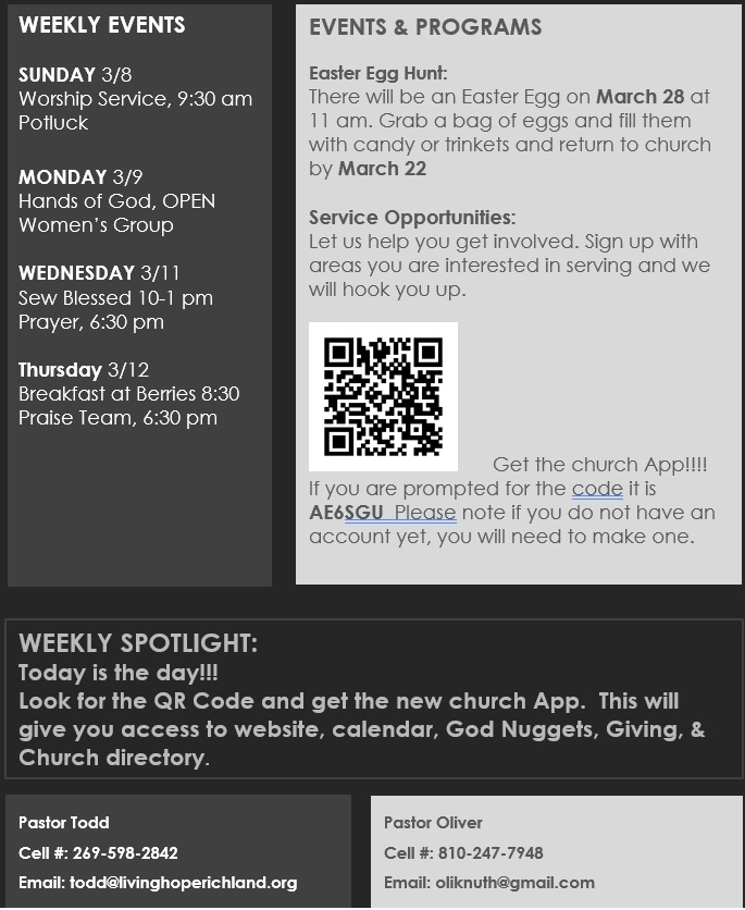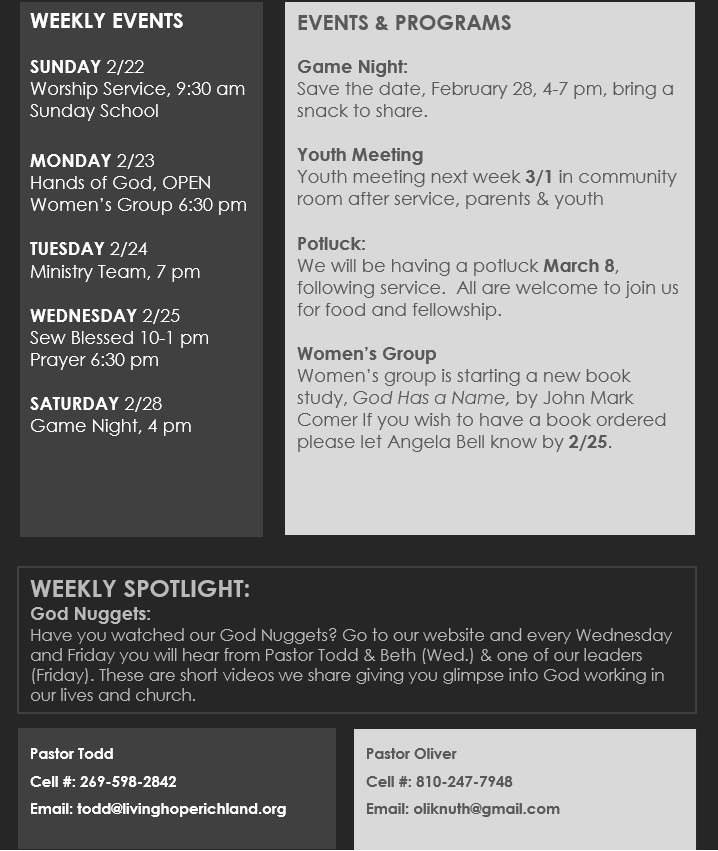 If you prefer to "visit" Living Hope from the comfort of your living room, sermons will be available later in the day each Sunday. Simply click on the Sermons link to view.