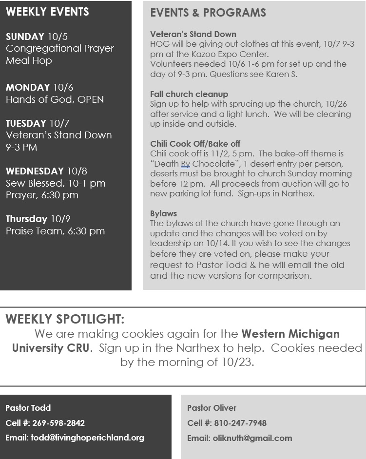 The mission of the Hands of God is to assist those who find themselves in need of a helping hand, bringing light to those who may be experiencing a season of darkness. Our clothing and small household goods distribution center is open every Monday and the first and third Saturday of each month from 9 a.m. to noon. To learn more about this important ministry of Living Hope Community Church, please visit our Facebook page.